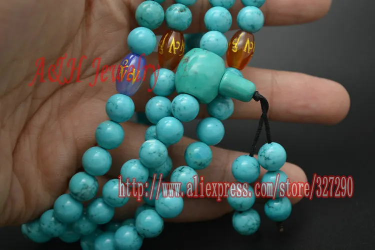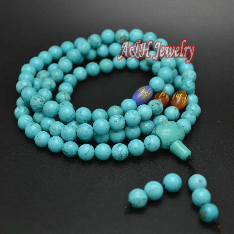 Best Natural Blue Howlite 8mm 108 Beads Prayer Mala Necklace 36 Inch Tibetan Jewelry Six Words Mantra Je