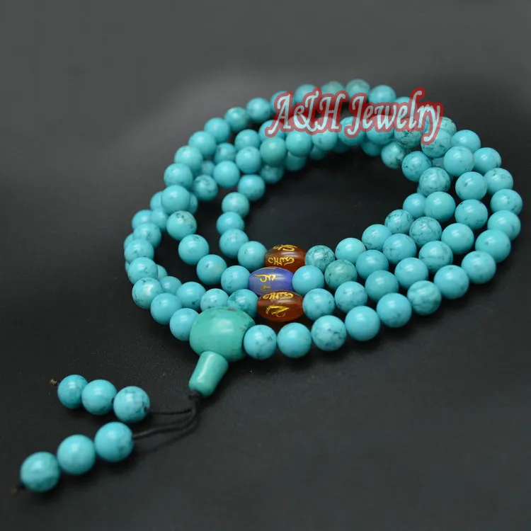 Hot Sale Natural Blue Howlite 8mm 108 Beads Prayer Mala Necklace 36 Inch Tibetan Jewelry Six Words Mantra Je