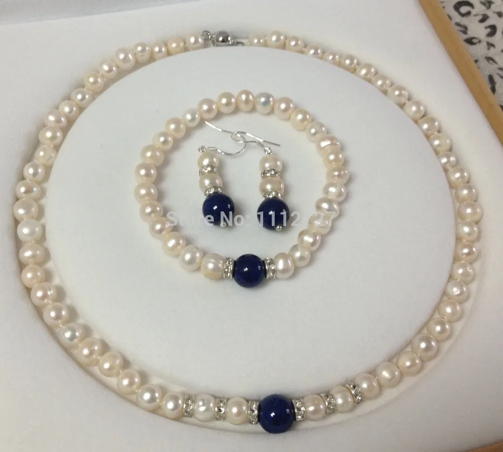 TOP women Fashion Jewelry 8-9mm White Pearl Lapis Beads Necklace Bracelet Earring Set Jewelry Sets Natu
